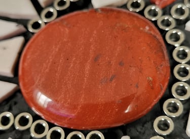 Matériaux : Marbre beige Svevo Perlato,, Marbre rouge de Vérone,, Emaux de Briard,, Cabochons de verre, Copeaux d’obsidienne, Perles d’hématite noire, Jaspe rouge, Fleur de nacre : ma signature