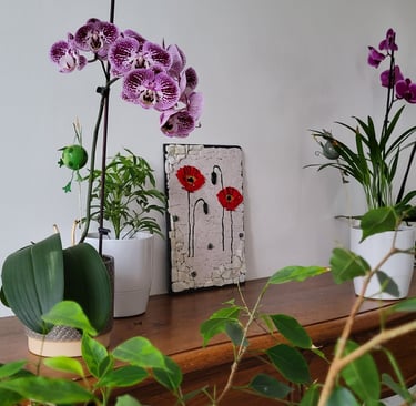Matériaux : Emaux de Briare. Smalt vénitien rouge. Copeaux d’obsidienne noire. Obsidienne dorée du Mexique. Roche. Fleur de nacre : ma signature