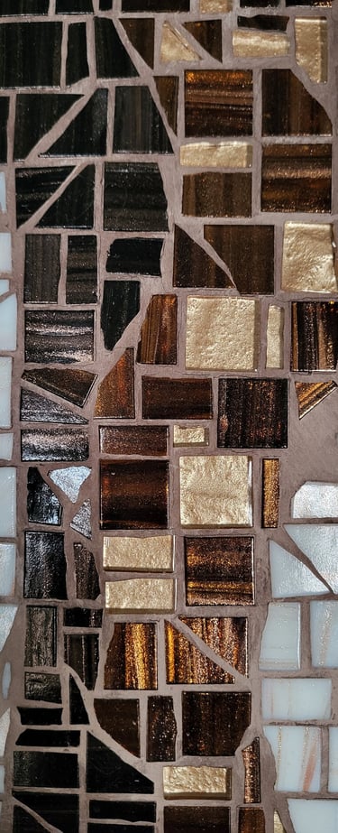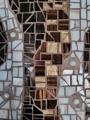Matériaux : Tesselles pâte de verre caramel Veinée d’or. Tesselles pâte de verre blanc Veinée d’or. Tesselles pâte de verre Cristal ondulé Baie d’Or. Billes de verre