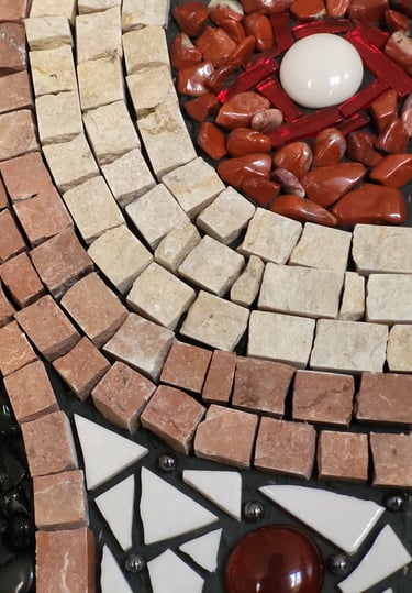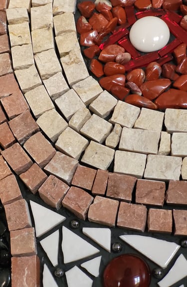 Une composition équilibrée où la géométrie épouse l'organique. Les tesselles de marbre dessinent des courbes harmonieuses qui dialoguent avec l'éclat du jaspe rouge et la profondeur des obsidiennes.
