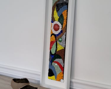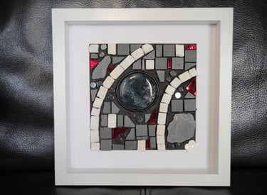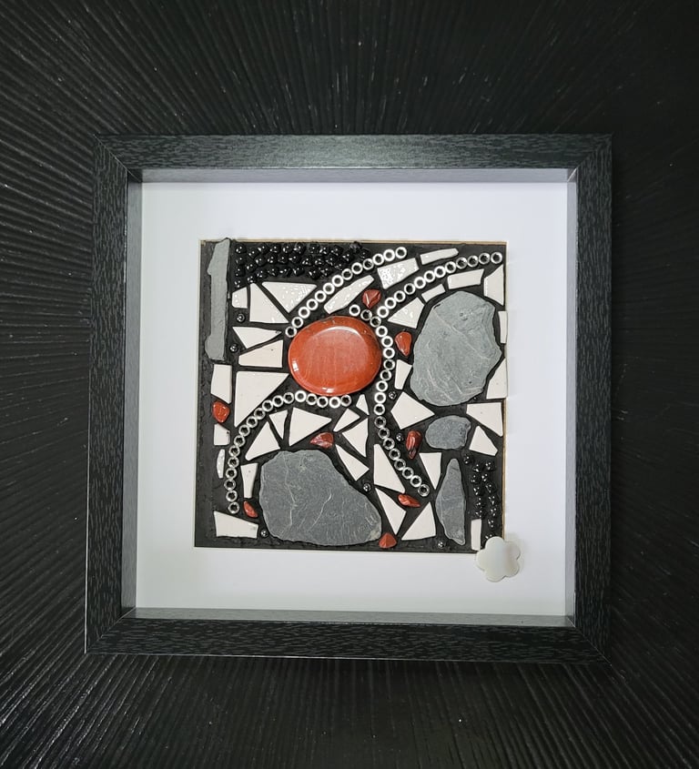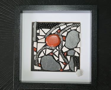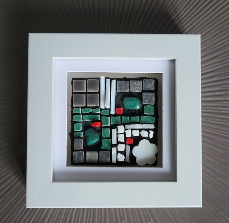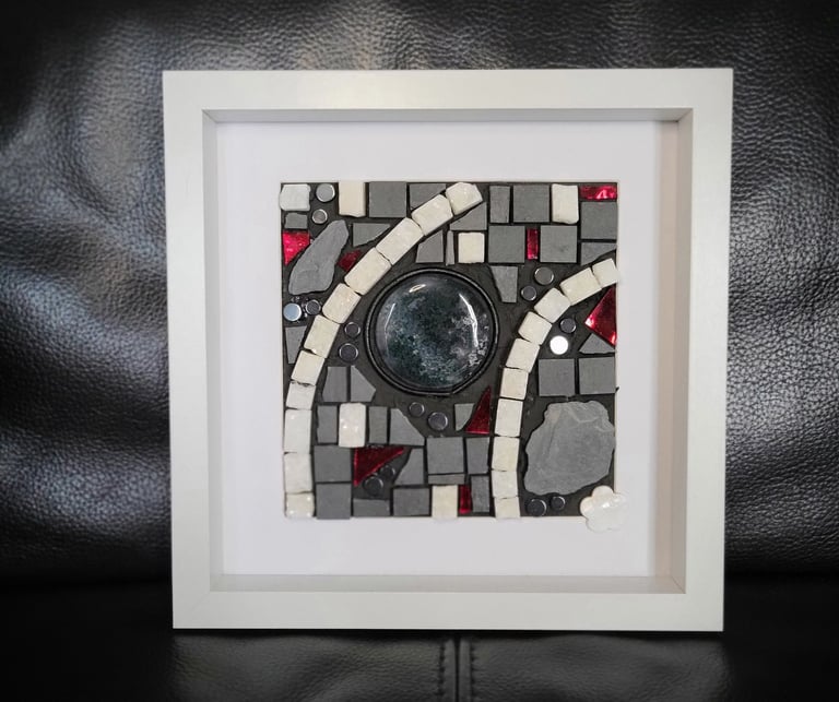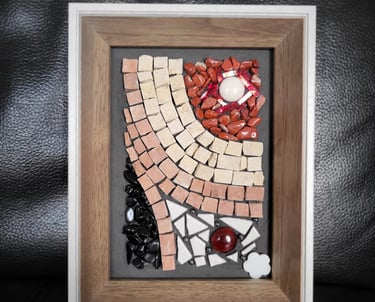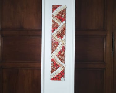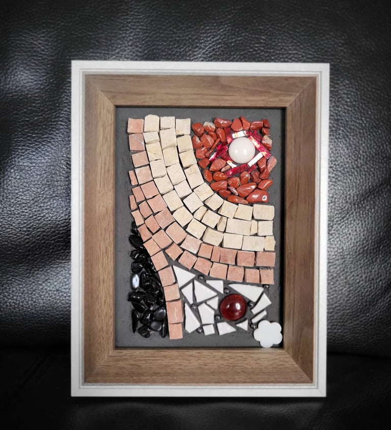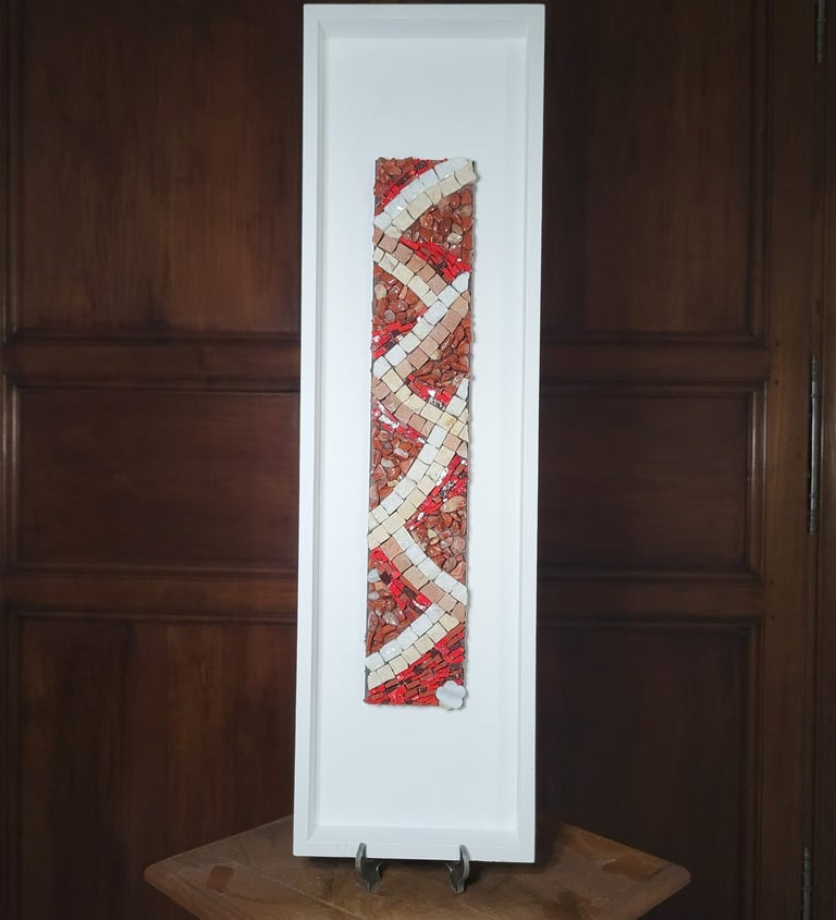 Chaque fragment trouve sa place dans cette danse de matières : la douceur des tons rosés contraste avec l'intensité du rouge sang, tandis que le noir apporte un ancrage graphique à l'ensemble. Les tesselles blanches ponctuent la création comme des respirations lumineuses.