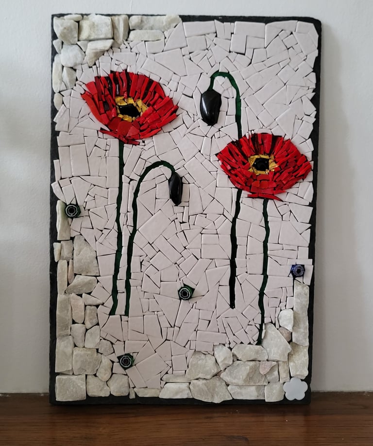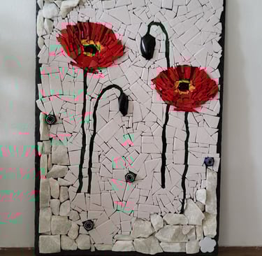 Les coquelicots, symboles de beauté éphémère et de résilience, transmettent un sentiment de liberté. Ils nous touchent par leur simplicité, une nostalgie douce qui rappelle les champs d'été et l'innocence de l'enfance. Ils montrent la capacité de s'épanouir même dans les conditions les plus simples ou même hostiles : les tesselles blancs (émaux de Briare) forment une texture brisée. L'instant est figé dans le vent : une pause fragile dans un monde minéral.