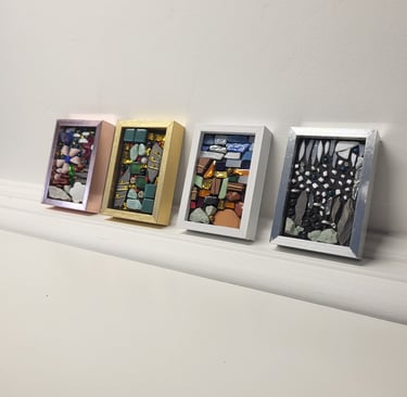 Œuvre célébrant le cycle naturel annuel, évoquant printemps, été, automne et hiver dans une harmonie temporelle, célébrant la beauté cyclique de la nature à travers ses transformations saisonnières. Chaque pièce est composée de fragments de pierres naturelles et semi-précieuses aux textures variées (lisses, rugueuses, scintillantes), soigneusement juxtaposés pour créer une impression à la fois organique et structurée. Ces mosaïques miniatures condensent en un espace réduit l’énergie d’une saison entière. Le format intime les rend proches, presque talismaniques : ce sont des objets d’ancrage que l’on peut approcher, observer, toucher du regard pour se reconnecter à un état émotionnel ou à un cycle naturel.
