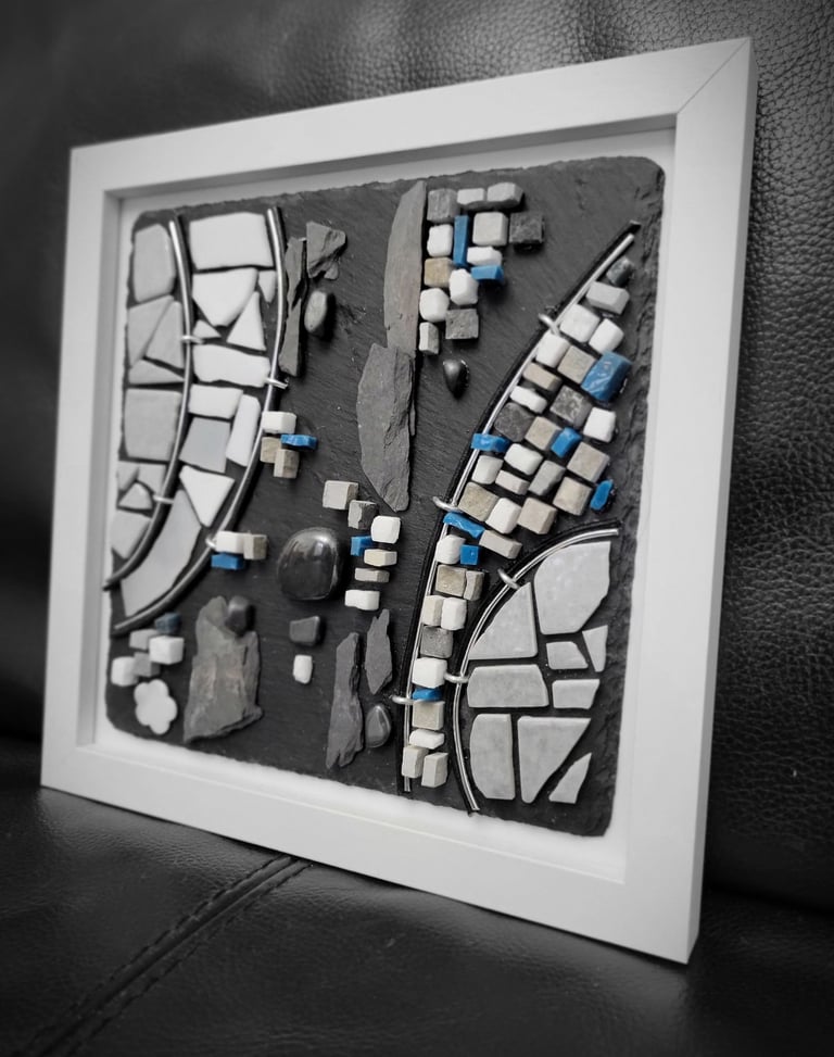 Une méditation sur le temps : Le contraste entre l'ardoise brute (éternelle) et les tesselles organisées (humaines) questionne notre rapport au temps et à la permanence.